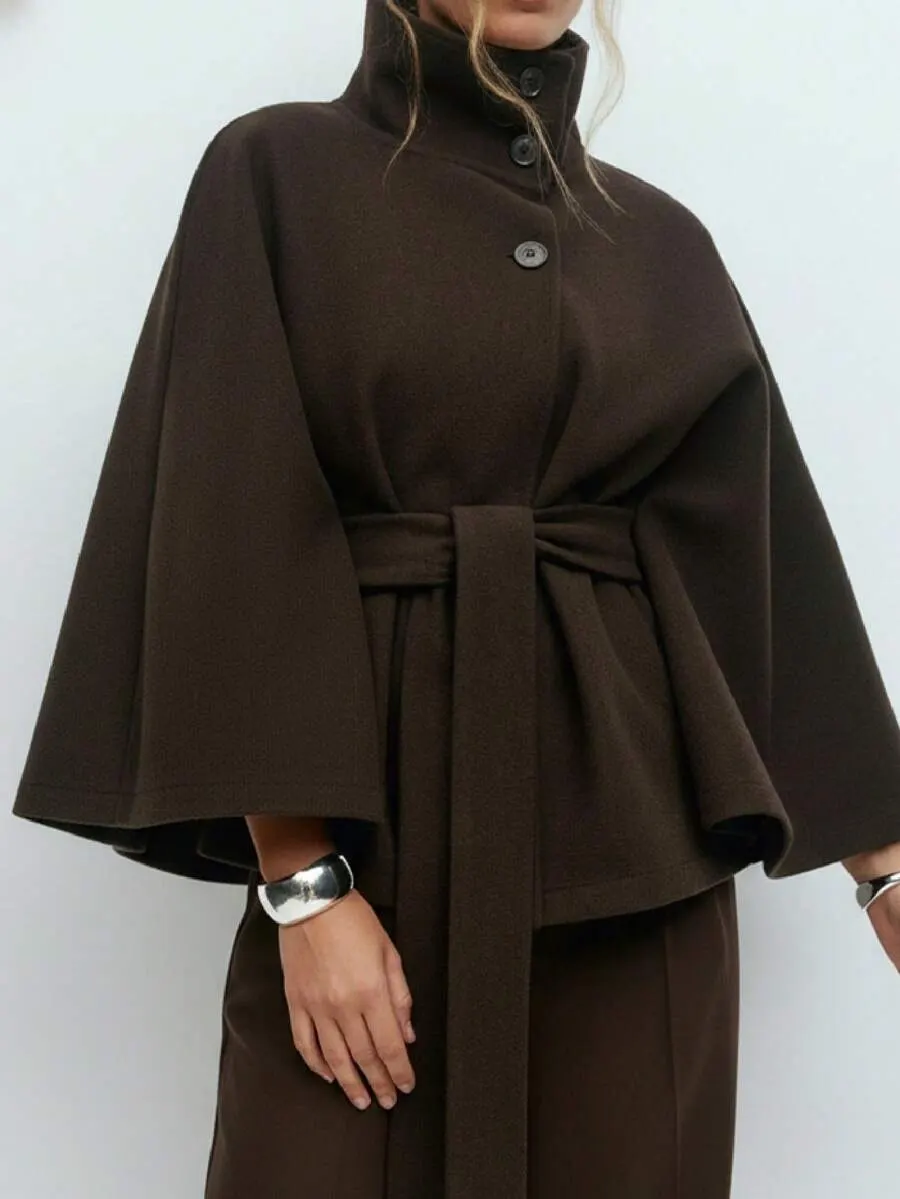 Capa de lana de unicolor con botones delanteros y cintura anudada para mujer, uso casual y de cita, abrigo de otoño/invierno